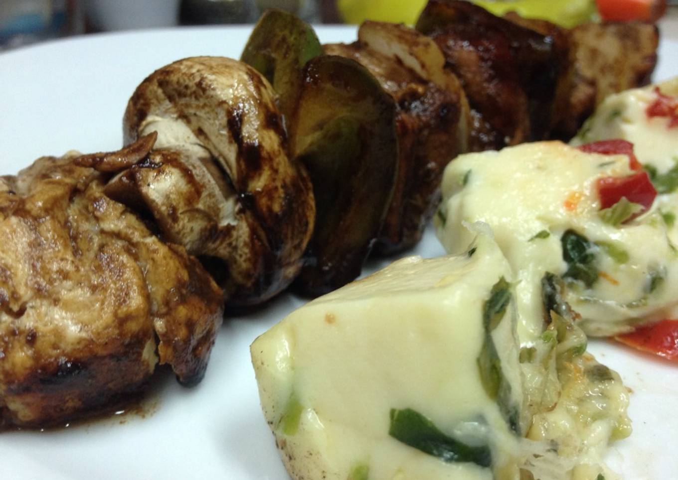- Inserta en un pincho cebolla pimiento carne champiñón cebolla pimiento,pollo y champiñón en ese orden