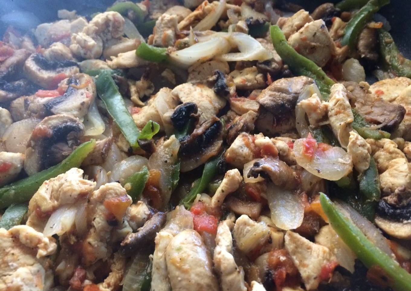 - Tapamos y dejamos cocinar un poco para que ablande la verdura, luego agregamos las especias, el caldo de pollo o sal y los champiñones, volvemos a integrar, tapamos, volvemos a mover, tapamos uno o dos minutos, retiramos del fuego y listo para acompañar con arroz o espagueti