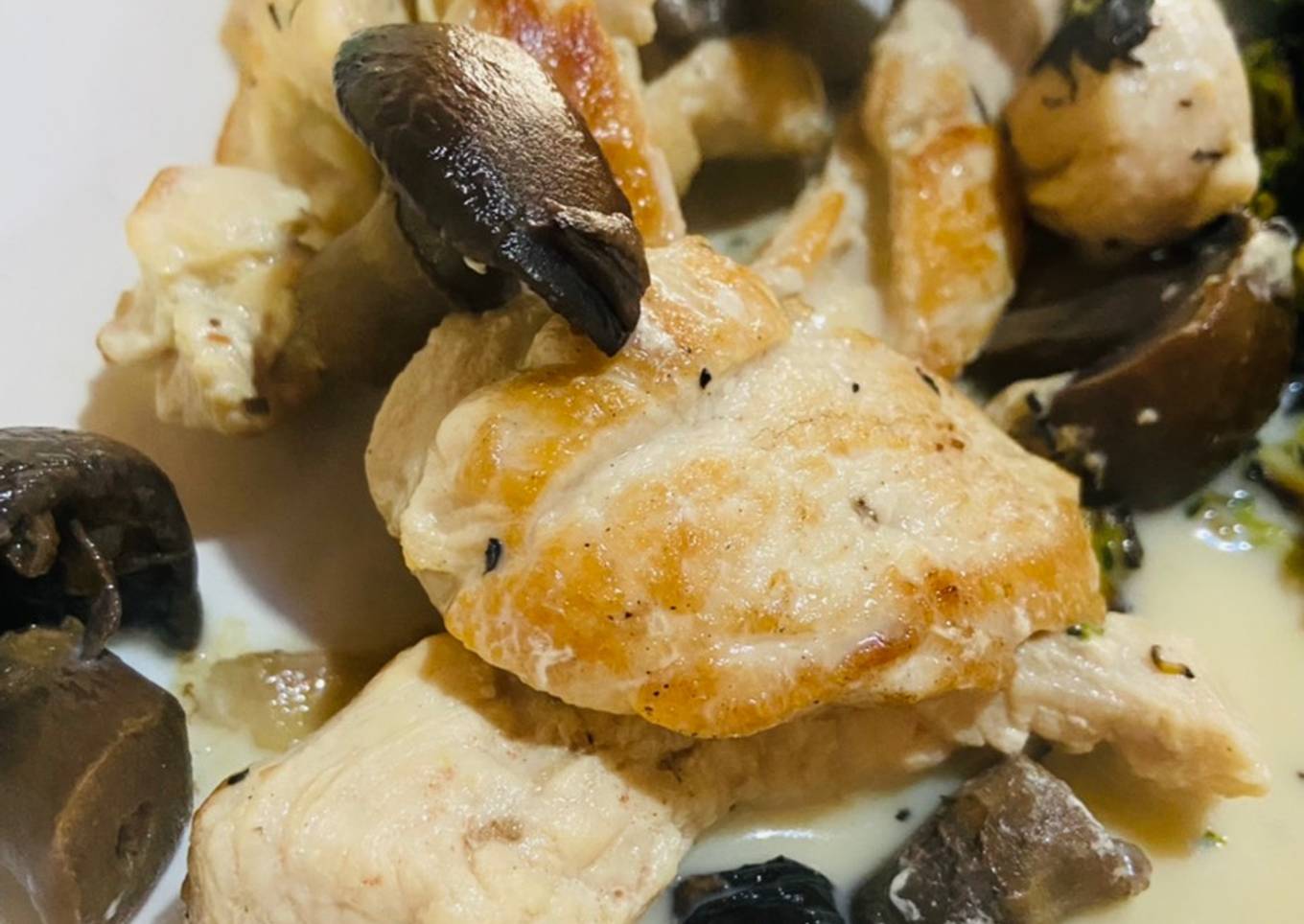 - Cuando los ingredientes anteriores estén cocinados, agregamos el vaso de leche y agua. Añadimos sal y pimienta al gusto, dejamos el pollo con champiñones a fuego medio hasta que el líquido se reduzca considerablemente y la salsa espese un poco. Y listo!!🥛