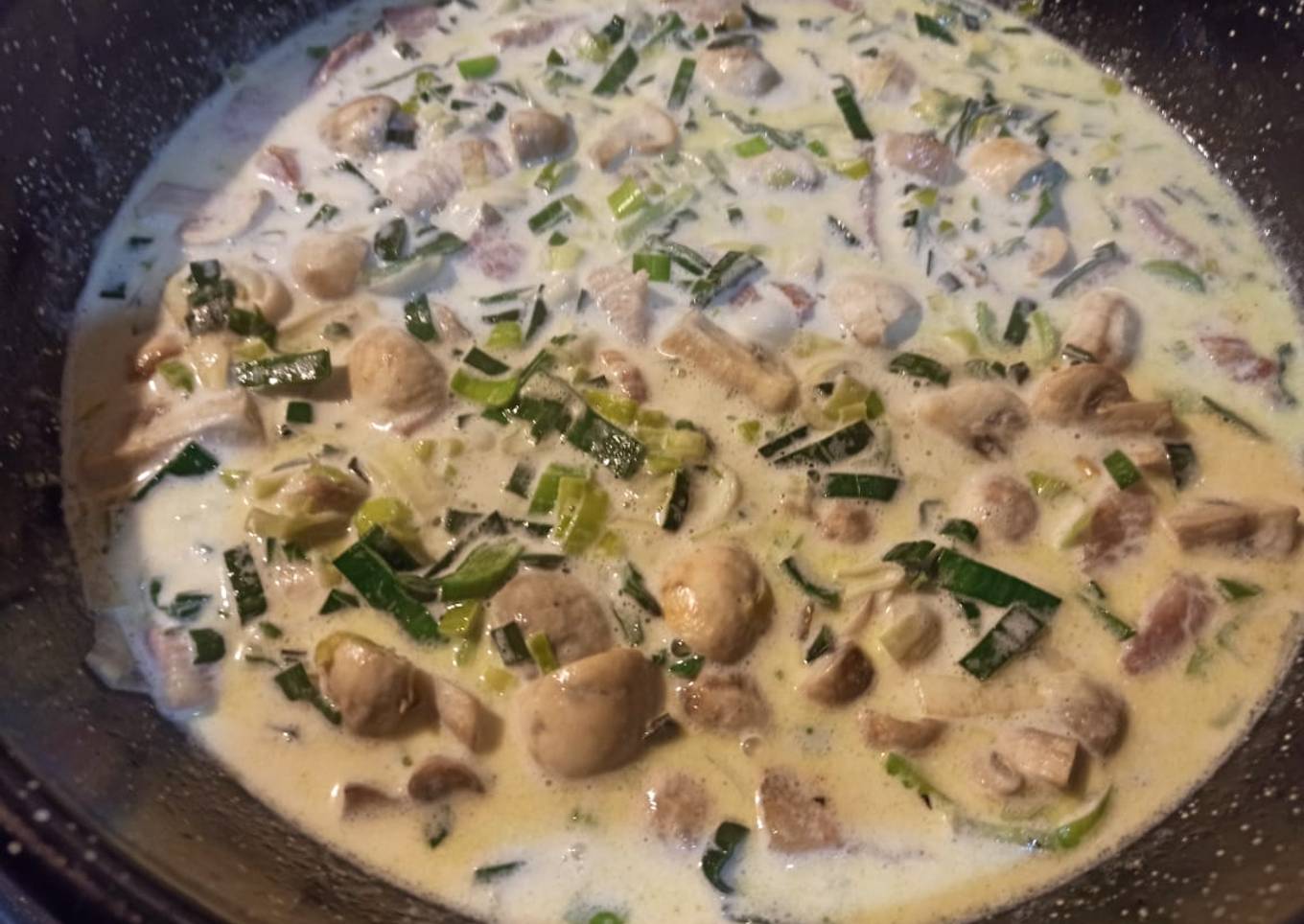 - Cuando estén un poco dorados los champiñones, salpimentar y agregar la crema.
