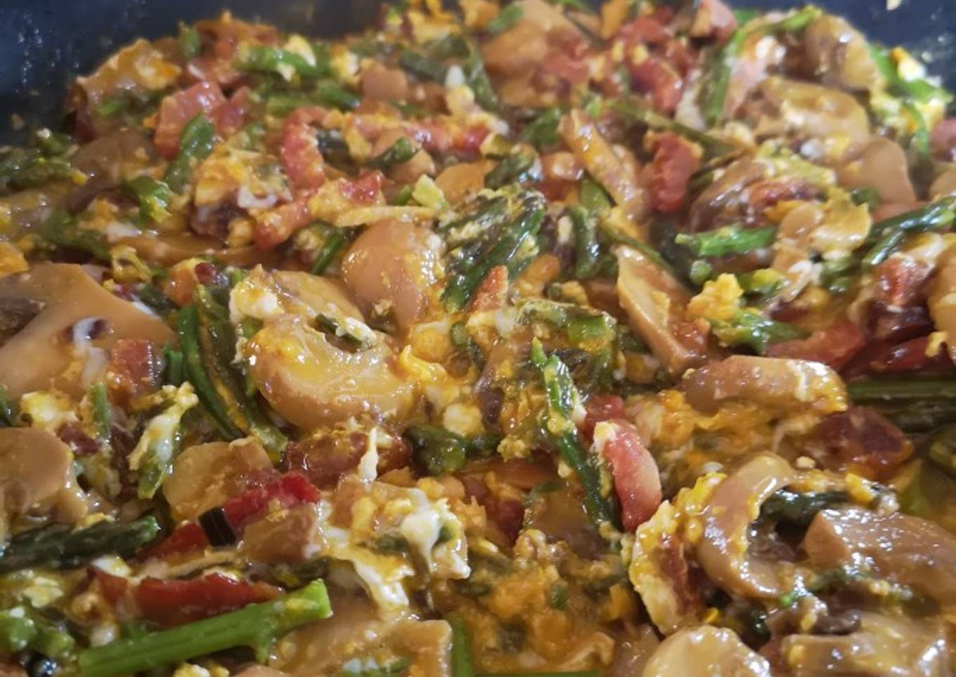 Revuelto de espárragos trigueros, champiñones, bacon y chorizo