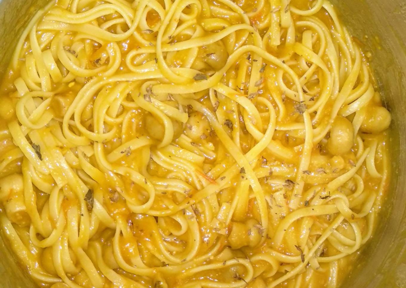 - Cuando los tallarines están cocidos los escurrimos y los echamos en la cazuela con el pisto y los champiñones, echamos un poco de orégano seco, damos unas vueltas y emplatamos, podemos ponerle queso rallado por encima, plato listo, a comer!!